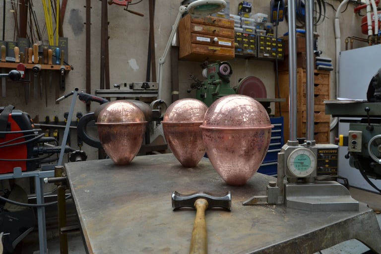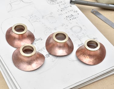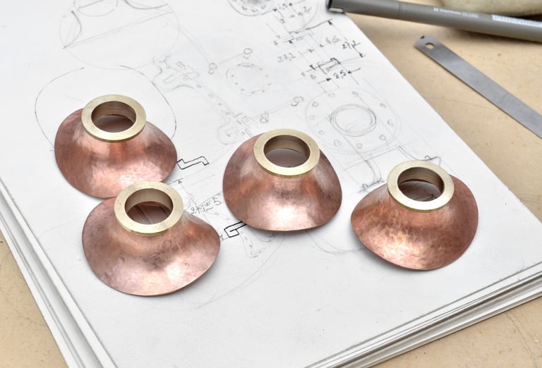Tripode Automate, cuivre mis en forme au marteau, structure en laiton et Palissandre 70cm.