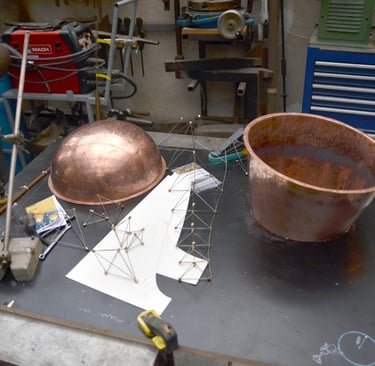 Station Marine Cuivre mis en forme au marteau, structure en laiton et ébène, voilure papier de riz, hauteur 35cm.