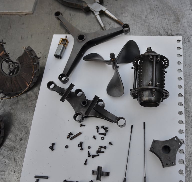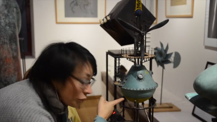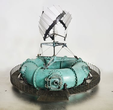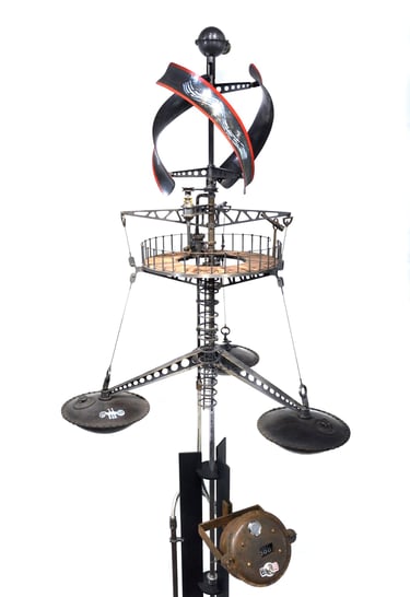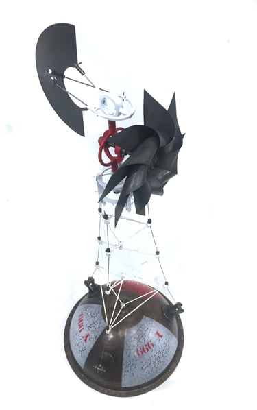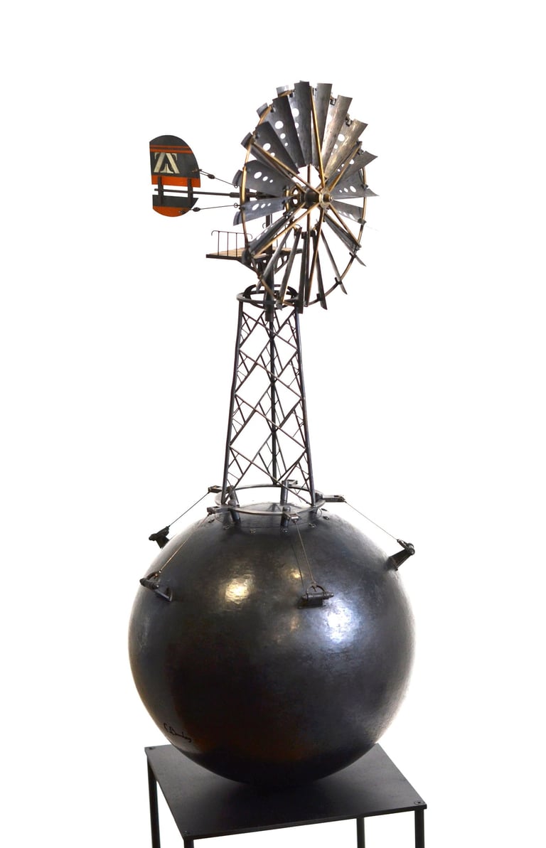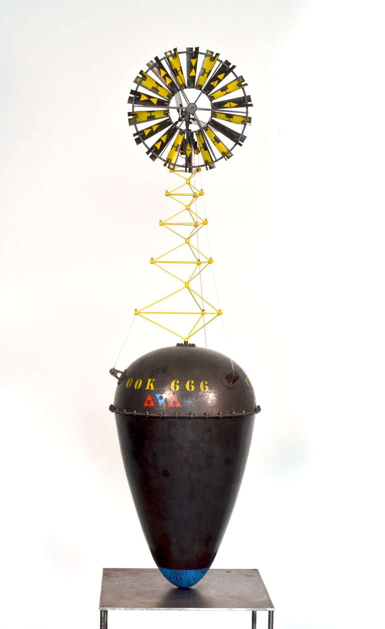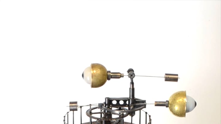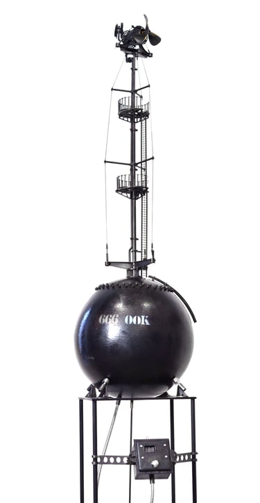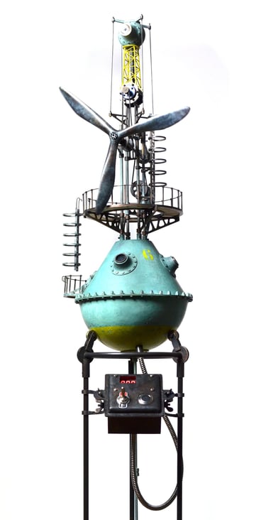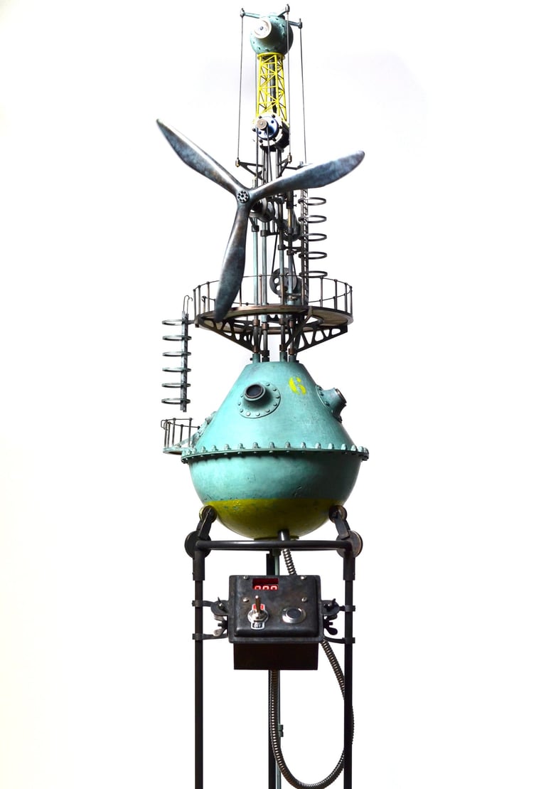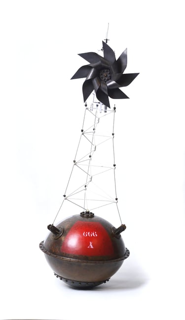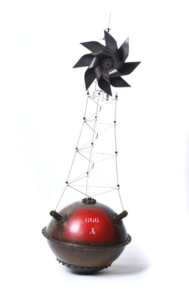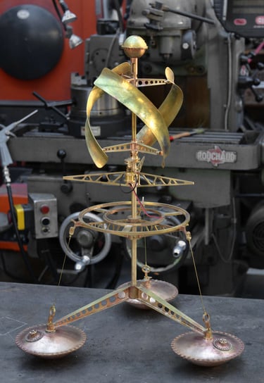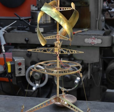 Spoutnik Automate, cuivre mis en forme et patiné, structure laiton, hélice motorisée, hauteur 80cm