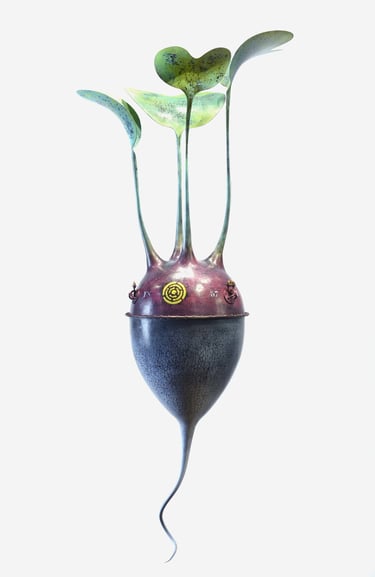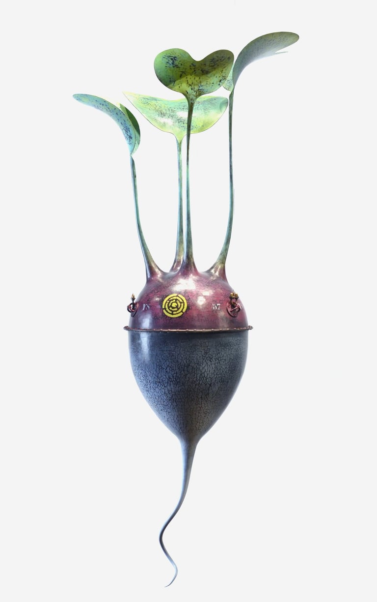 Radis Cuivre mis en forme au marteau, accastillage et feuilles en laiton, hauteur 110cm.
