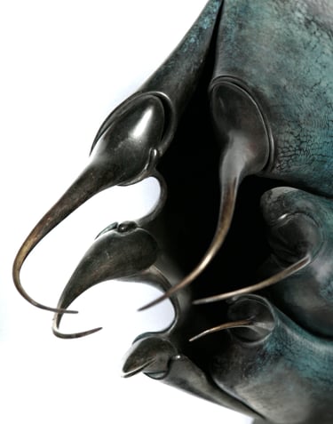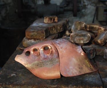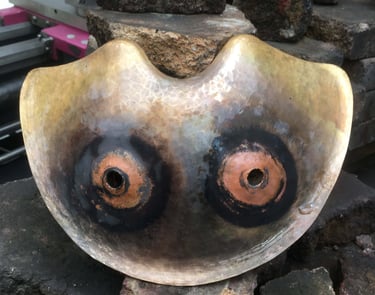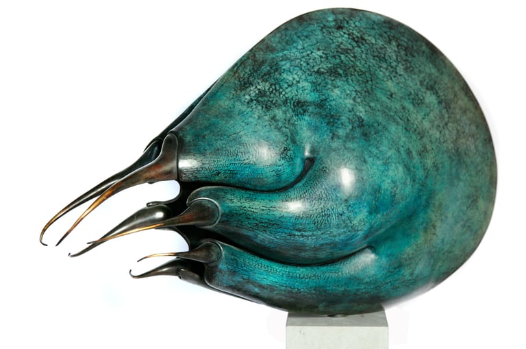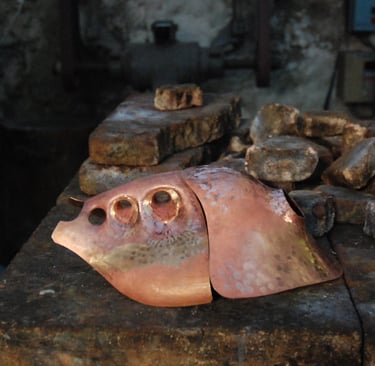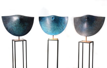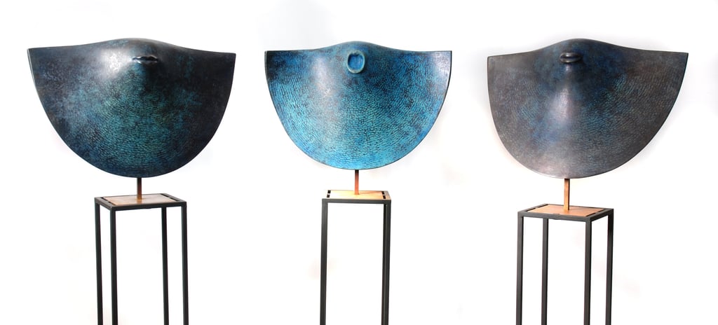 Triptyque de raies Cuivre mis en forme au marteau, patiné, bouches ciselées, largeur 40cm, 2009.