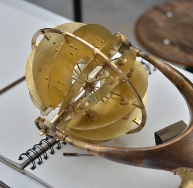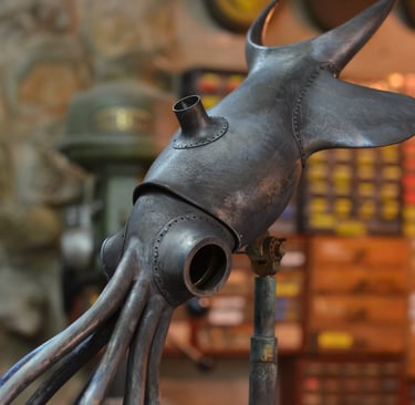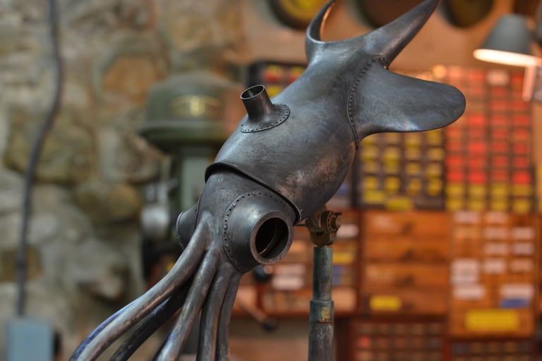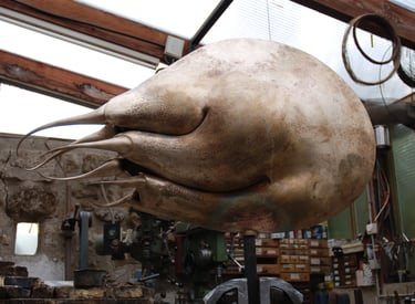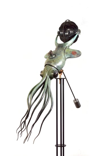 Calmarmobil Cuivre mis en forme au marteau, patiné, tentacules en laiton, longueur 90cm, 2025.