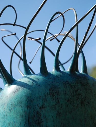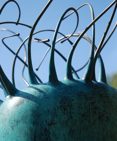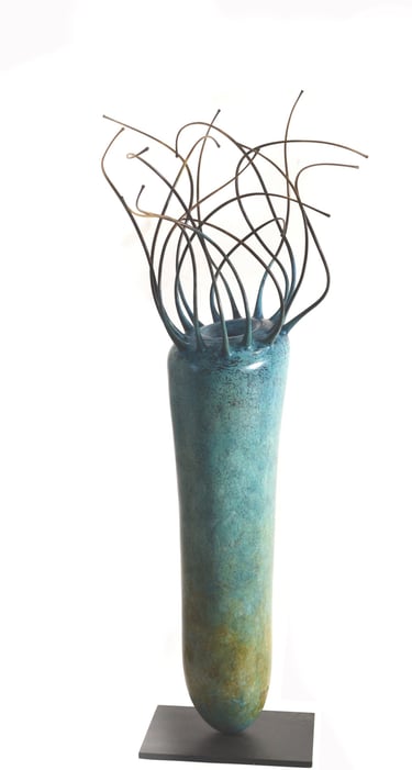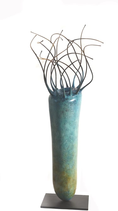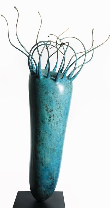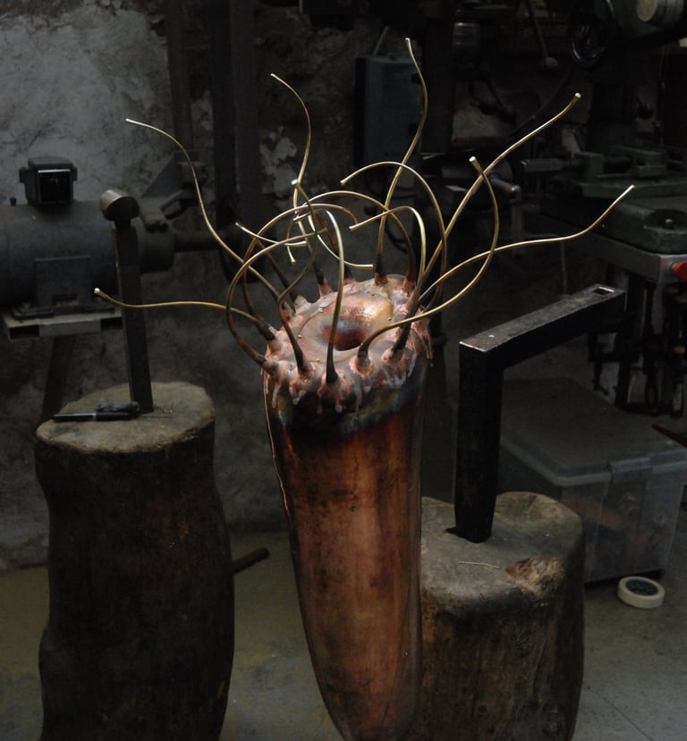 Anémone Cuivre mis en forme au marteau, patiné, flagelles en laiton, hauteur 95cm, 2009.