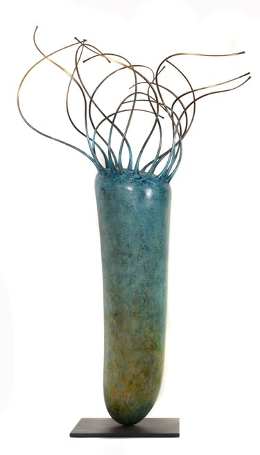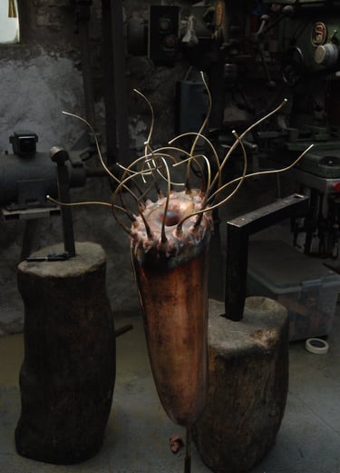 Anémone Cuivre mis en forme au marteau, patiné, flagelles en laiton, hauteur 95cm, 2024