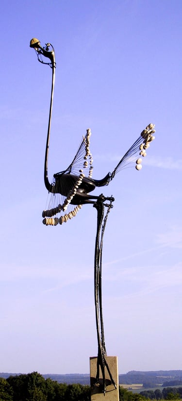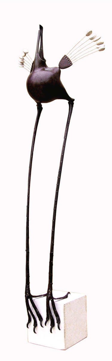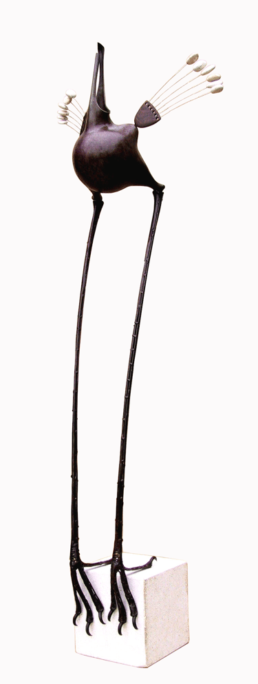 Grand Echassier cuivre mis en forme, galets, acier, hauteur 150cm, 1996.