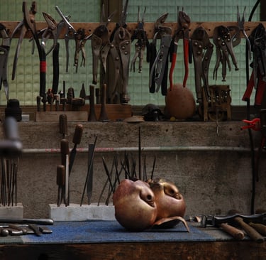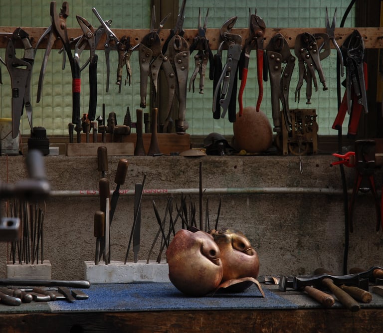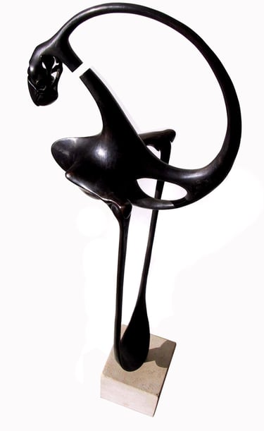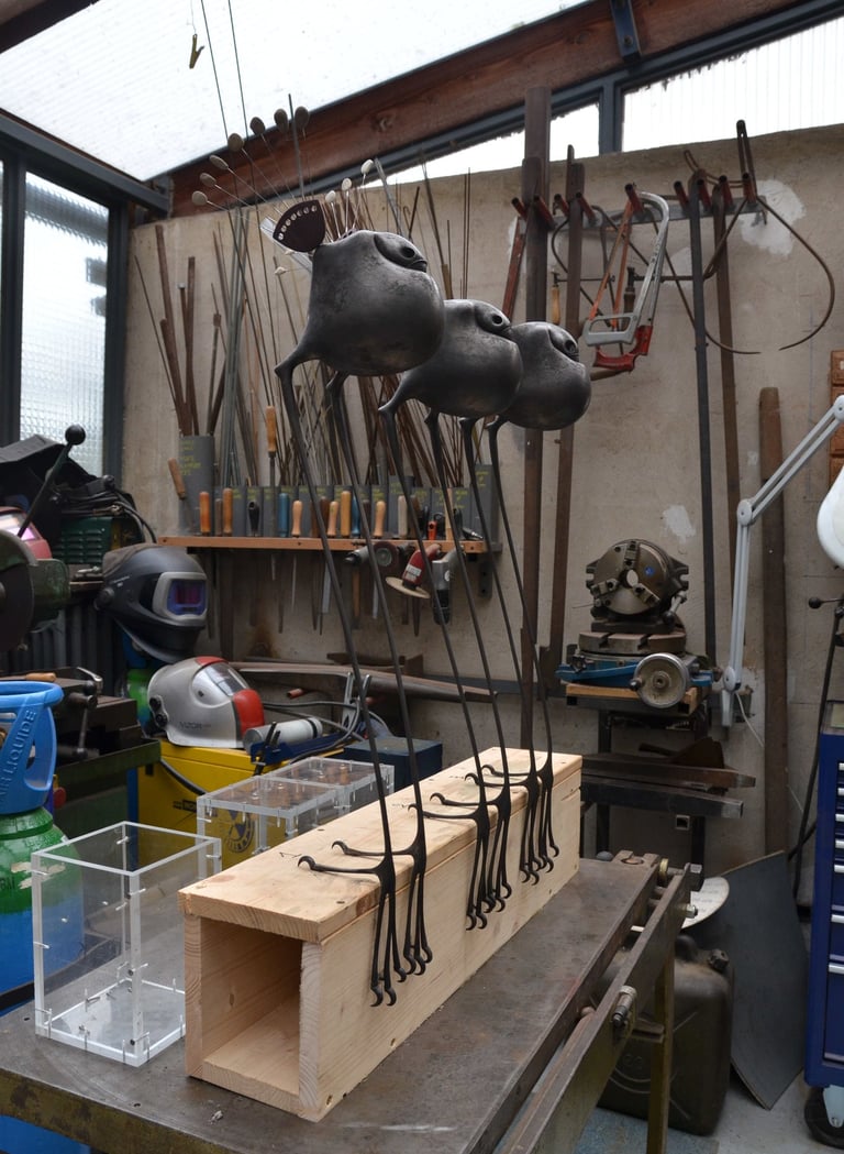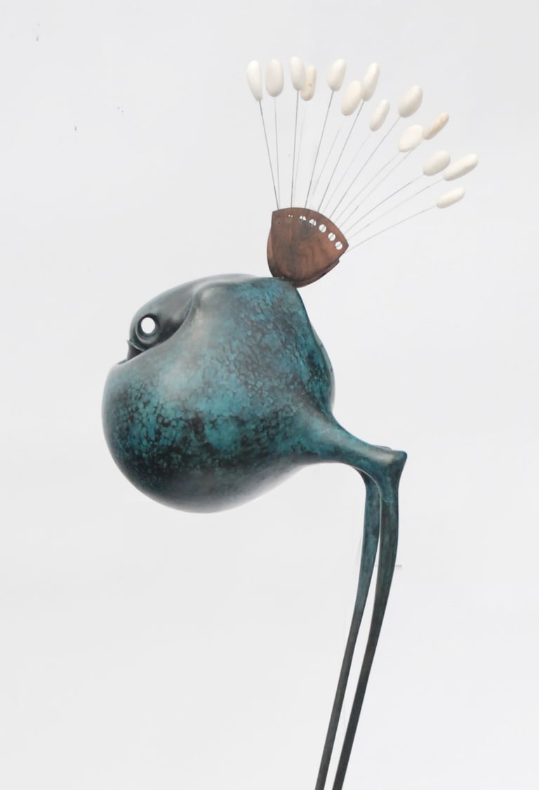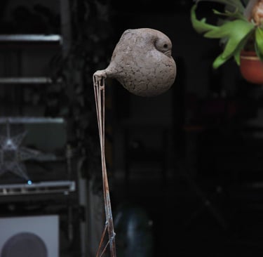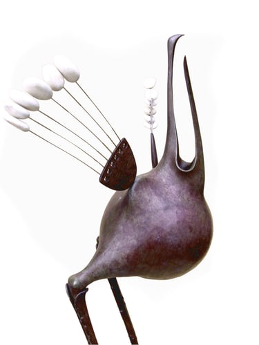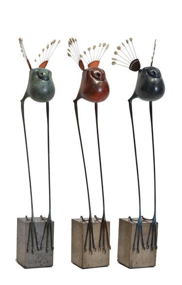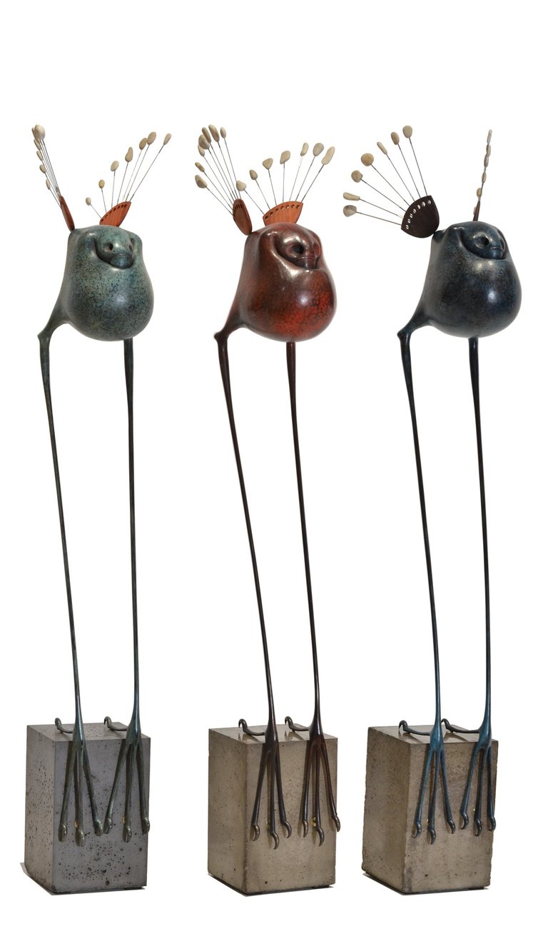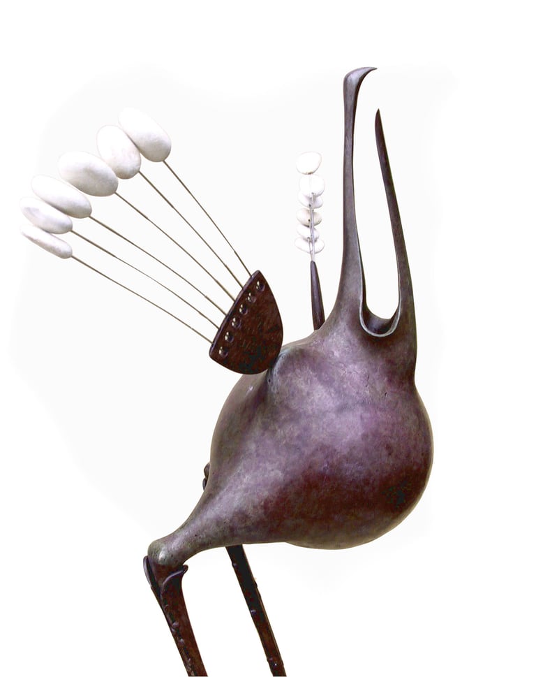 Échassiers boudeurs corps cuivre mis en forme, palissandre et galets, pattes en laiton, hauteur 70cm, années 20165-2025.