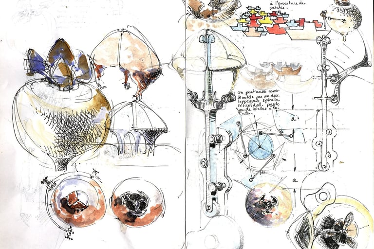 Le mécanisme construit à partir d'élément de carillon d'horloge Comtoise, provoque l'éclosion lente de la corolle pendant 15 minutes, arrivée à son apogée la fleur se referme en une minute.